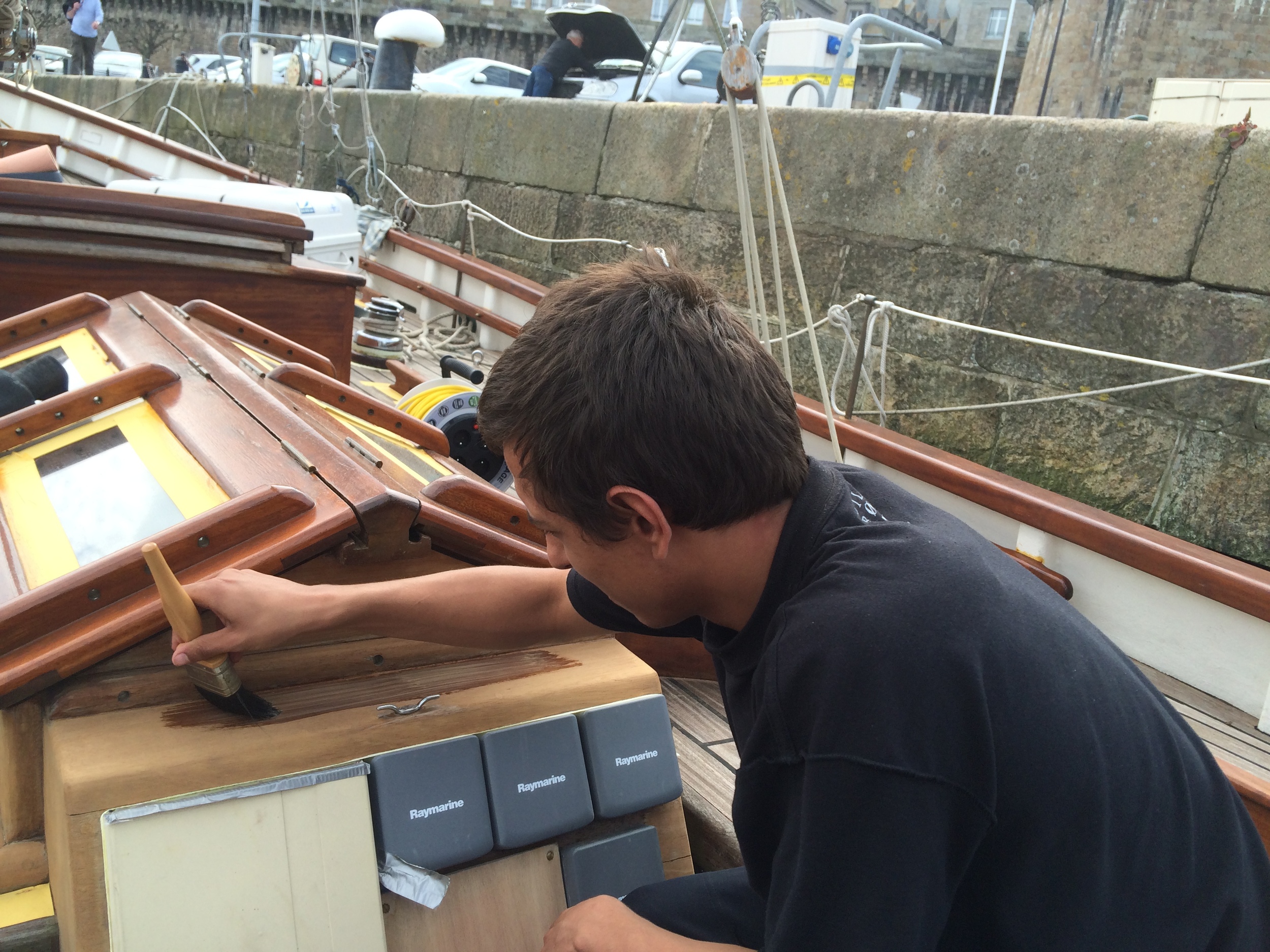 It's early April and we've had some good weather. So Davi is taking advantage of the clear skies to put some varnish on the boats. Just like the Emerald City in The Wizard of Oz, we have our own "Wash and Brush Up Company" that spit shines our boats every year. And the results are... pretty impressive!